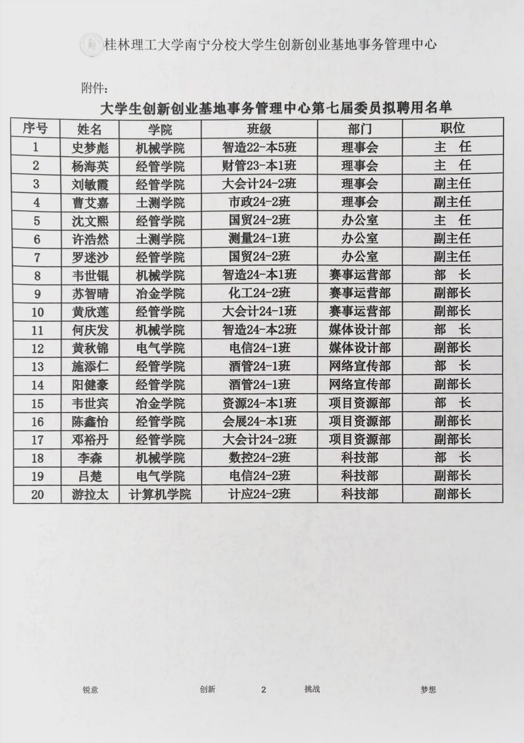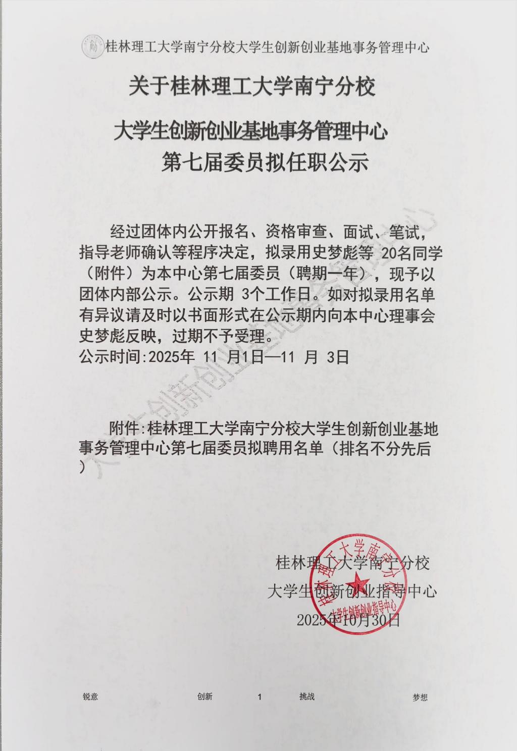 关于桂林理工大学南宁分校大学生创新创业基地事务管理中心第七届委员拟任职公示