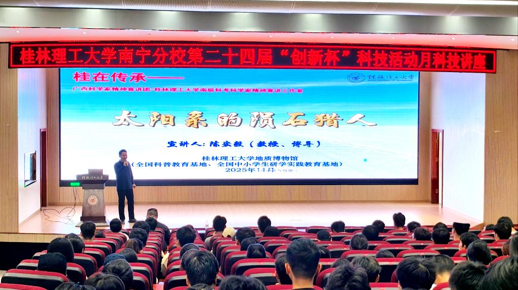 2025年11月14日下午,桂林理工大学地质博物馆副馆长、中国地质学会、矿物岩石地球化学学会科普工作委员会委员陈宏毅教授在8408报告厅作“太阳系的陨石猎人”专题讲座,南宁分校师生聆听讲座。