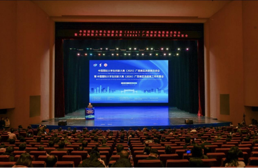 2026年1月9日,中国国际大学生创新大赛(2025)广西赛区选拔赛总结会暨2026年大赛工作布置会在广西大学汇学堂隆重举行。本次会议由自治区教育厅指导、广西大学承办,汇聚了全区高校创新创业教育负责人、企业代表和专家。南宁分校副校长马华菊率大学生创新创业指导中心全程参会,分校空港校区设立分会场。
