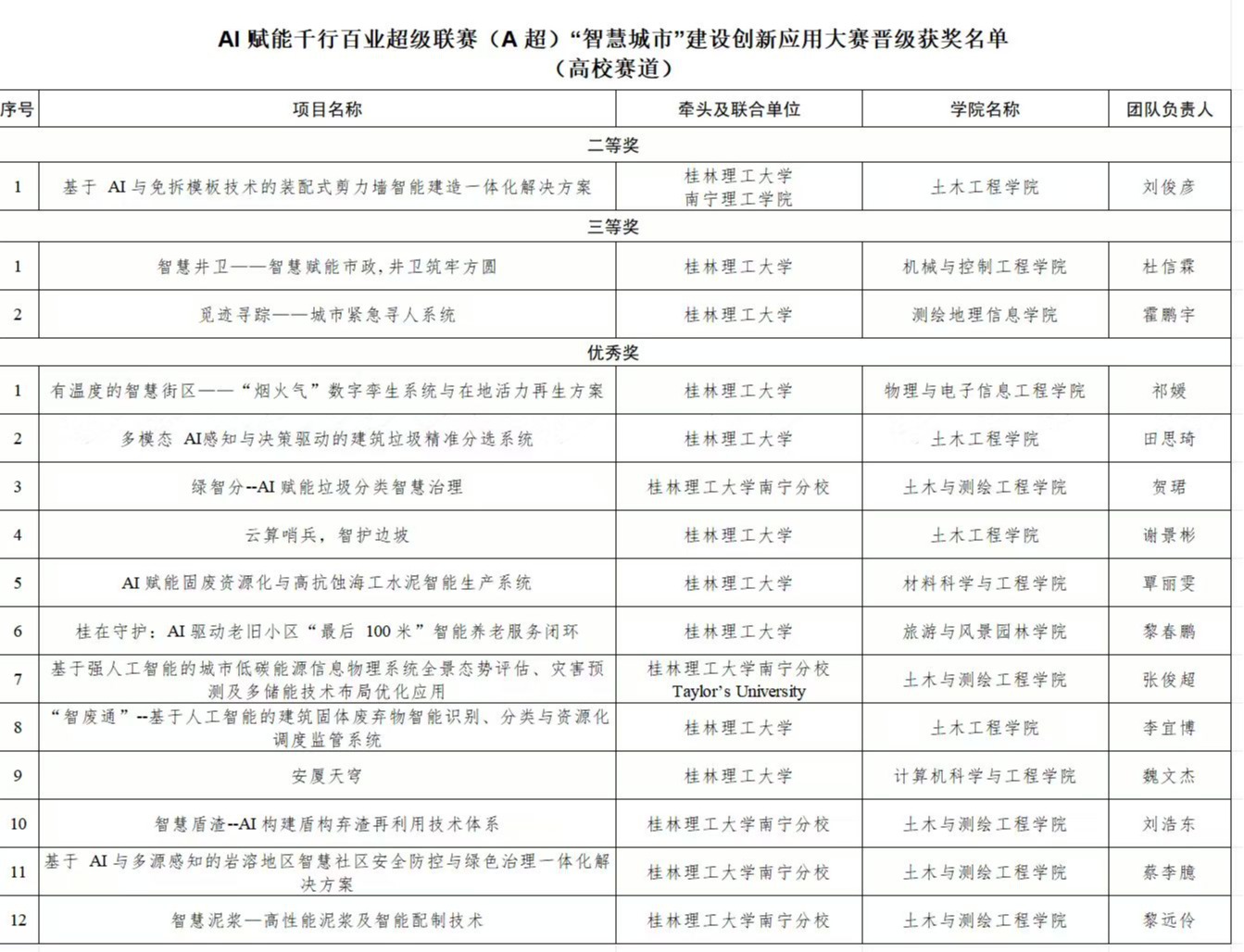 近日,由自治区住房和城乡建设厅主办的AI赋能千行百业超级联赛(A超)“智慧城市”建设创新应用大赛高校赛道获奖名单正式公布,我校参赛项目获奖。