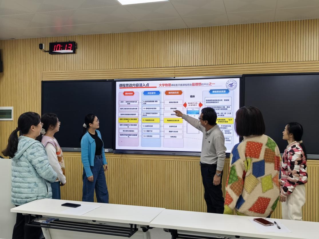 点评环节中,陆生鲜副教授指出应挖掘物理学科内在思政内涵,如通过科学史激发探索精神,结合科技成就增强学生自信;罗英和副教授从说课结构、表达与课件呈现等方面提出建议,强调思政元素须自然融入教学。其他教师也积极参与交流,分享教学实践经验。