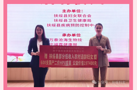 仪式上,厦门万泰沧海生物技术有限公司向扶绥县捐赠价值197400元的国产二价HPV疫苗600支,专项用于我县农村适龄妇女免费接种。这一善举体现了企业对社会责任的积极担当,也为项目的顺利实施提供了有力支持。