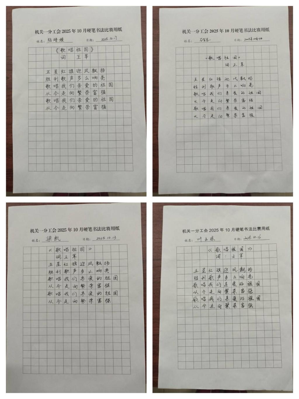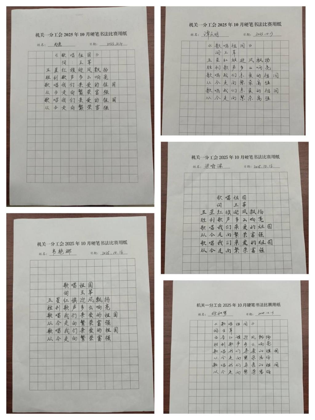 为传承中华优秀传统文化,激发教职工的爱国情怀,营造积极向上、书香满溢的工作氛围,2025年10月13日至17日,机关一分工会以“笔墨传情颂祖国”为主题,成功举办了教职工硬笔书法比赛。