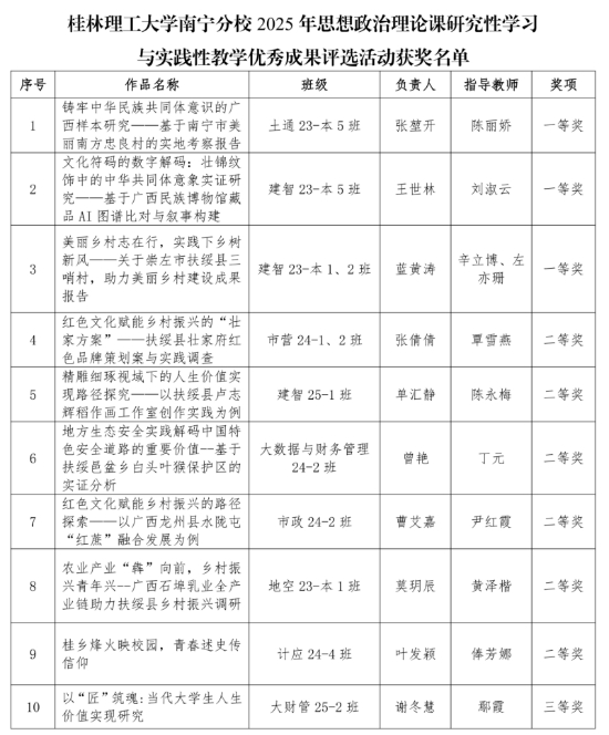 此次评选活动通过以赛促学、以评促建,为学生搭建了理论联系实际的实践平台,推动了思政课从“课堂讲授”向“实践育人”的延伸,让学生在亲身体验中深化对党的创新理论的理解,增强社会责任感与使命感。未来,南宁分校将持续优化思政课实践教学体系,不断提升思想政治教育的针对性与实效性,为培养担当民族复兴大任的时代新人筑牢思想根基。