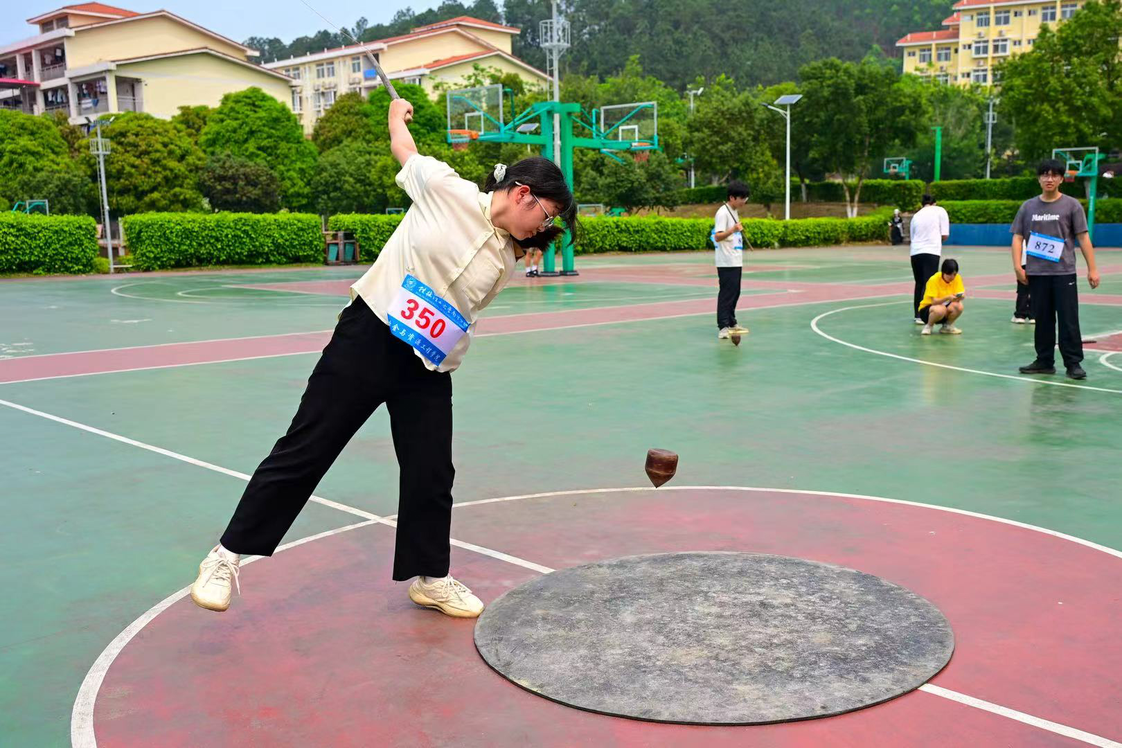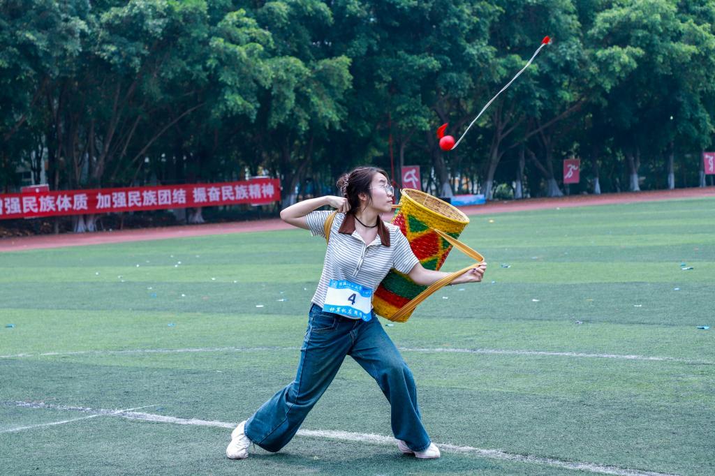 以绣球投掷传递民族韵味。背篓绣球、高杆绣球赛场比拼热烈,运动员们凝神投掷、绣球凌空,精准入篓、稳稳中靶,尽显娴熟技巧与沉稳定力。教职工趣味赛事同步开展,师生同场竞技、其乐融融,小小绣球联结民族文化与校园温情,成为赛场上最亮丽的风景。