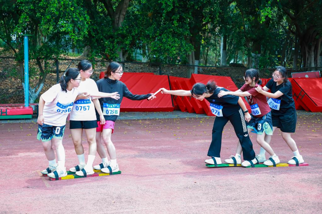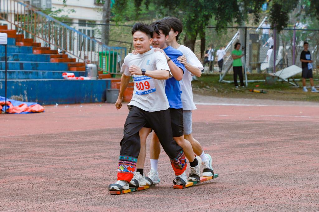 以板鞋竞速演绎同心力量。田径场上,运动员们脚缚长板、步调一致,口号铿锵、奋力疾驰。从预赛稳扎稳打到决赛全力冲刺,大家默契配合、同心同向,用整齐的步伐生动诠释“人心齐、泰山移”的团队精神,每一次并肩奔跑都凝聚着信任与力量。