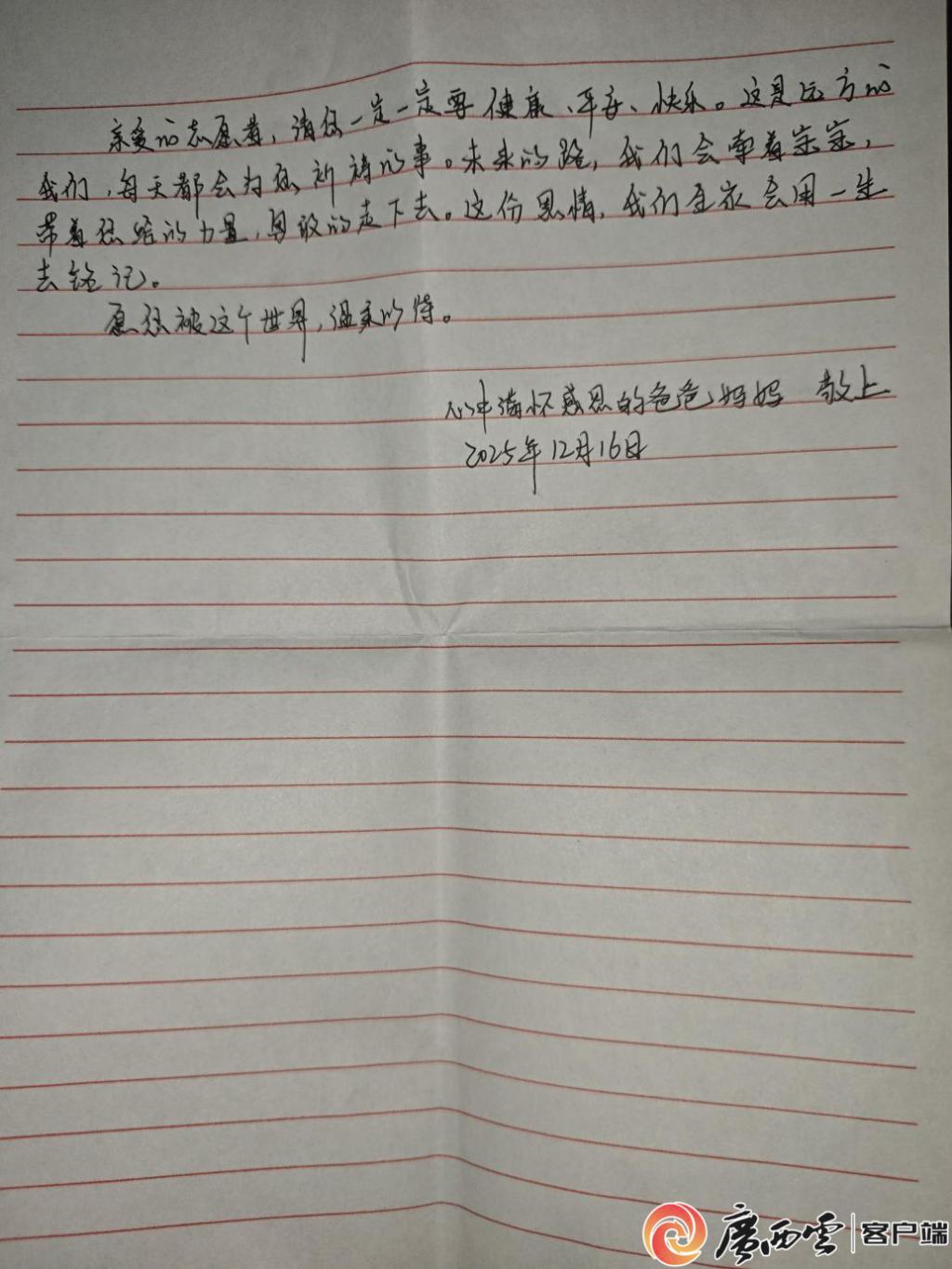 当被问及想对受助者说的话时,覃赫想了想,认真地说:“好好享受人生吧。希望这份来自陌生人的温暖,能让你感受到世界的美好。也让我们将这份爱心传递下去,温暖更多的人。”