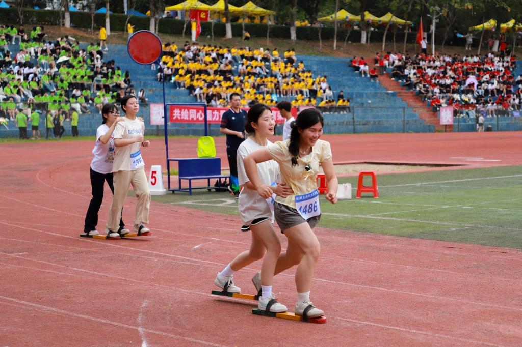 板鞋竞速赛场,运动员脚缚长板、口号震天,步伐整齐如齿轮咬合。各队或起步即冲刺如离弦之箭,或中途稳加速似蓄势奔马。他们以默契律动诠释“人心齐、泰山移”,整齐的脚步声化作团结的节拍,掠过跑道的身影凝成协作的剪影。