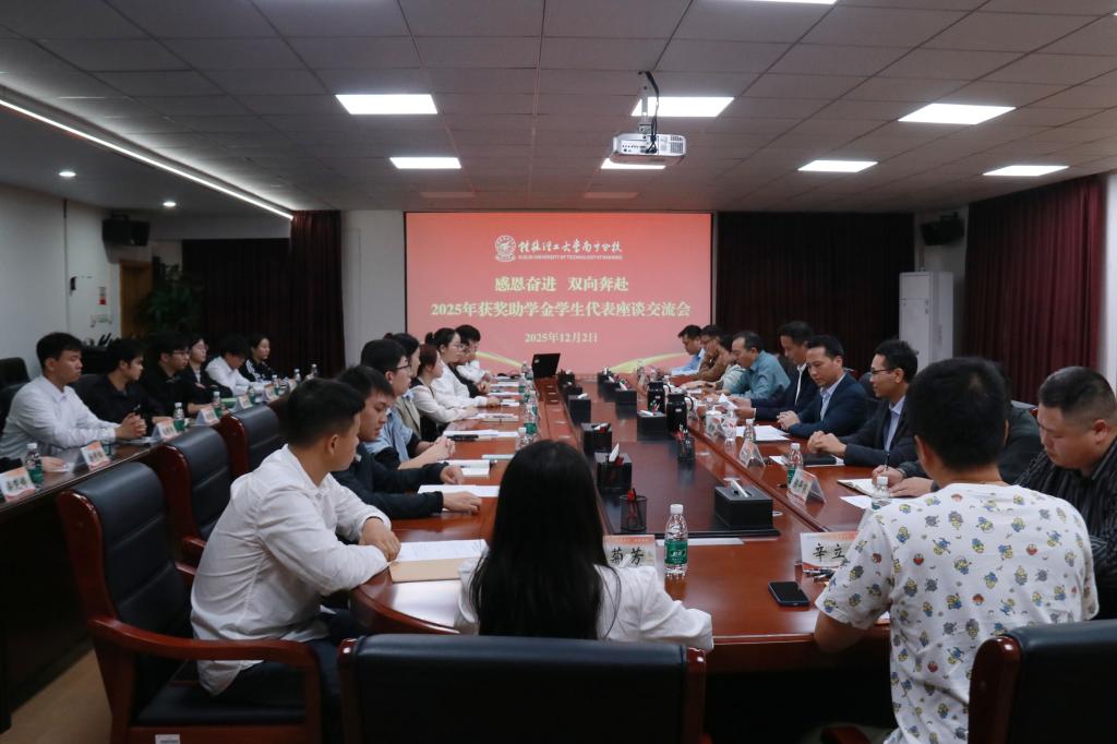12月2日下午,南宁分校在空港校区行政楼416会议室举办“感恩奋进 双向奔赴”2025年获奖助学金学生代表座谈交流会。南宁分校党委副书记唐承泽,副校长刘高鹏出席会议。“有为奖助学金”捐赠者、杰出校友黄真强受邀出席会议。党委学生工作部负责人,各学院党委副书记及获奖助学金学生代表参加会议。会议由刘高鹏主持。
