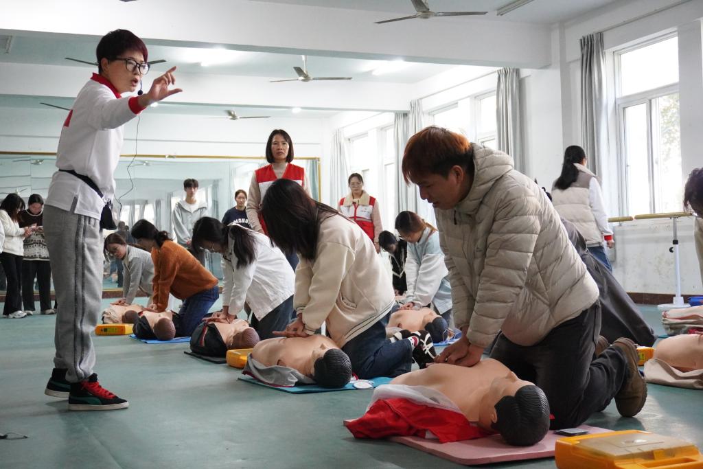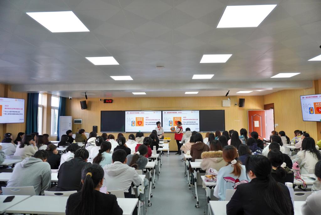 此次培训活动通过“理论授课+操作示范+实地演练”的形式,对心肺复苏急救技术、AED的使用等应急处理措施与规范流程进行讲解。在理论授课现场,红十字会人员凭借深厚的急救知识,根据专业工作环境及特点,用通俗易懂的语言,为学生们深入浅出地讲解了心肺复苏的基本概念、重要性及实际操作中的关键要点。
