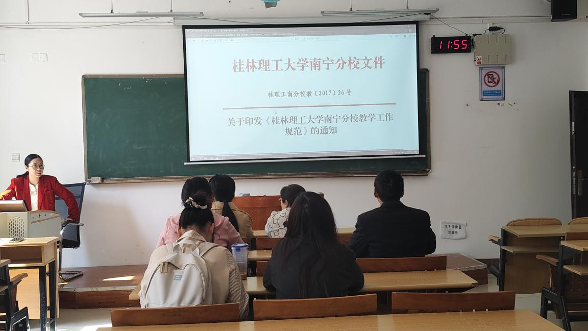 教研室老师集中认真学习了《桂林理工大学南宁分校教学工作规范》《桂林理工大学教材管理实施细则》《南宁分校落实“十大工程”三年行动方案》《教育教学改革与研究项目管理办法》等规范文件内容与精神。
