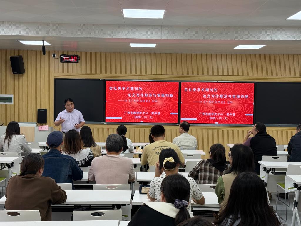 活动现场,黄仲盈聚焦“哲社类学术期刊的论文写作规范与审稿判断——以《广西民族研究》为例”这一主题,深入浅出地就论文选题、框架搭建、规范表达的细节要求等方面进行了深入剖析,并结合个人审稿经验分享对学术创新、逻辑严谨性、现实意义的核心考量和对学术研究初心、跨学科融合的深刻思考。