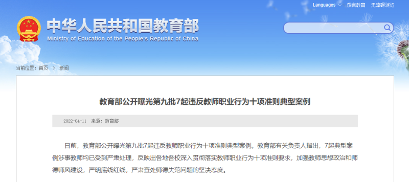 日前,教育部公开曝光第九批7起违反教师职业行为十项准则典型案例。教育部有关负责人指出,7起典型案例涉事教师均已受到严肃处理,反映出各地各校深入贯彻落实教师职业行为十项准则要求,加强教师思想政治和师德师风建设,严明底线红线,严肃查处师德失范问题的坚决态度。