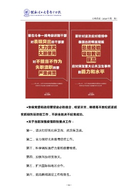 纪检简报(2020 年第一期) ●各级党委和政府要坚定必胜信念,咬紧牙关,继续毫不放松抓紧抓 实抓细各项防控工作,不获全胜决不轻言成功。 ●关于当前加强疫情防控重点工作: 第一,坚决打好湖北保卫战、武汉保卫战。 第二,全力做好北京疫情防控工作。 第三,科学调配医疗力量和重要物资。 第四,加快科技研发攻关。 第五,扩大国际和地区合作。 第六,提高新闻舆论工作有效性。 —11—