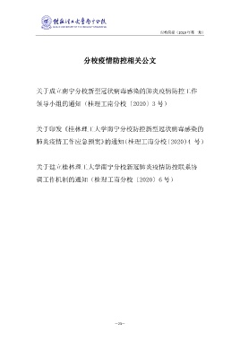 纪检简报(2020 年第一期) 分校疫情防控相关公文 关于成立南宁分校新型冠状病毒感染的肺炎疫情防控工作 领导小组的通知(桂理工南分校〔2020〕3 号) 关于印发《桂林理工大学南宁分校防控新型冠状病毒感染的 肺炎疫情工作应急预案》的通知(桂理工南分校〔2020〕4 号) 关于建立桂林理工大学南宁分校新冠肺炎疫情防控联系协 调工作机制的通知(桂理工南分校〔2020〕6 号) —23—