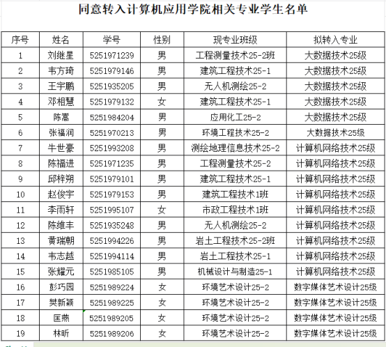桂林理工大学南宁分校计算机应用学院2025级全日制大专学生转换专业学生名单公示