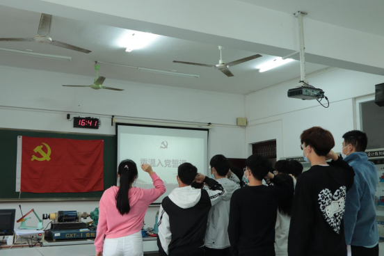 第一个活动,由丘东林同志带领大家在3304教室,重温入党誓词,并向党组织表示廉洁自律,爱岗敬业的决心,使全体党员心灵接受一次红色文化的洗礼,从而加强党员的党性修养。