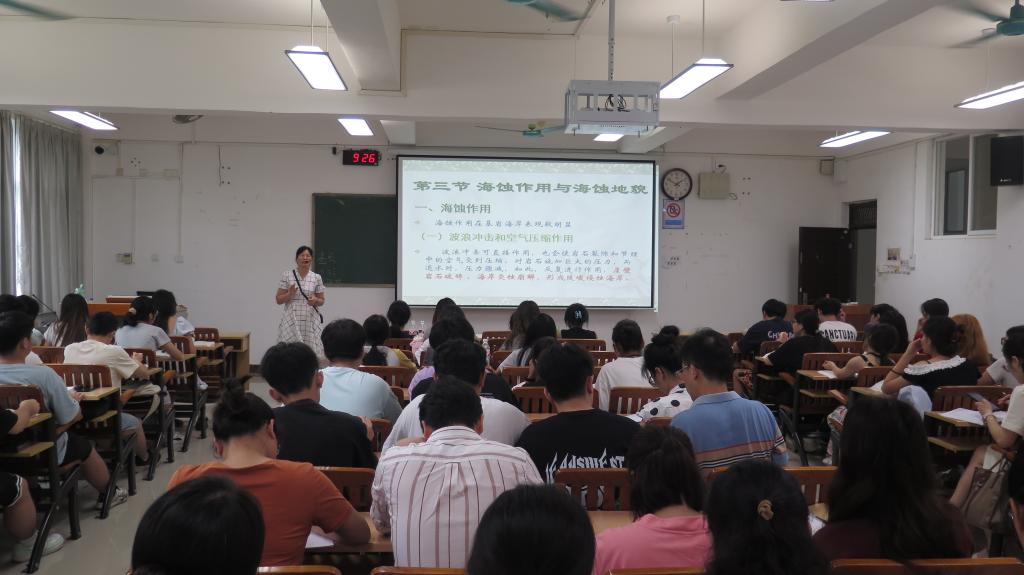 课上,潘红艳老师从海蚀地貌的基本概念、形成原理、海蚀作用机制、典型海蚀地貌类型、海蚀地貌的发育演化过程等方面开展教学。在讲解过程中,潘老师运用丰富的地貌图片与实际案例,引导学生探索海洋地貌特征,并通过课堂互动激发学生思考,课堂氛围活跃。