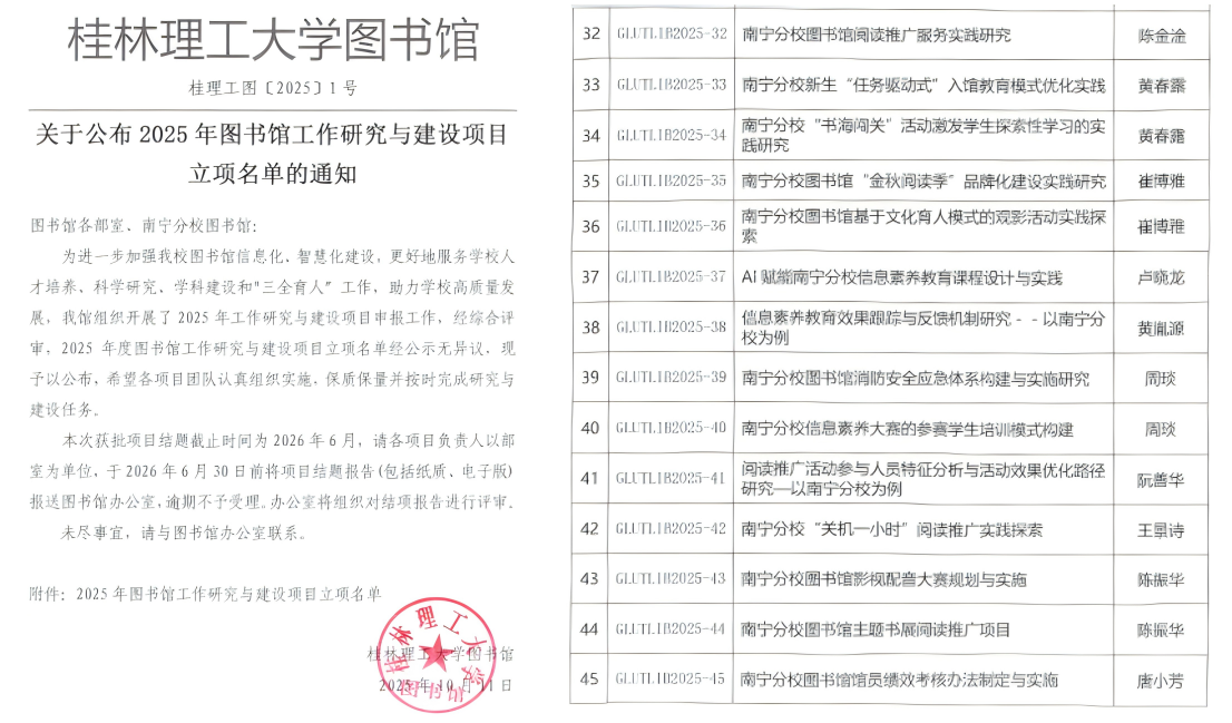 图书馆高度重视科研引领业务发展,通过统筹规划、精心组织,推动科研与业务实践深度融合。馆内成立科研小组,积极动员并指导馆员申报各级各类课题,成效显著:全年获批校级图书馆工作研究与建设项目14项,实现了馆内全员100%立项的新突破;党建与思政研究取得进展,获学校党建与思想政治研究课题立项1项;市厅级科研项目稳步推进,新增立项1项,顺利结题3项;学术成果发表持续增长,馆员公开发表论文4篇。通过将实践探索转化为理论成果,有效促进了业务交流与服务水平提升。
