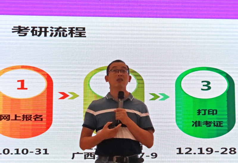 会议伊始,主讲人刘高鹏先为我们分析2020年全国的普通高校应届毕业生毕业发展规划。紧接着,刘教授先就为什么考研、考研的意义展开,鼓励同学们能够继续学习为将来更好的就业打下基础。接着从历届全国研究生录取数据,以及桂林理工大学南宁分校三年考研数据进行分析,让同学们更加认清当前的考研形势。然后根据自己潜心研究多年的宝贵经验,向我们传授他的考研策略,希望我们能够刻苦认真,扎实打下基础,多阅读课外书籍,为自己未来打拼,让我们受益匪浅。刘教授的演说贴近现实,举例丰富,赢得了场下观众的阵阵掌声。