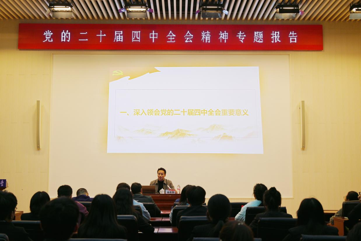 报告中,唐承泽围绕学习贯彻习近平总书记在党的二十届四中全会上的重要讲话精神,系统阐述了全会的重大意义、鲜明特点与核心内容,为同学们带来了一堂内容深刻、内涵丰富、贴合青年实际的精彩报告。