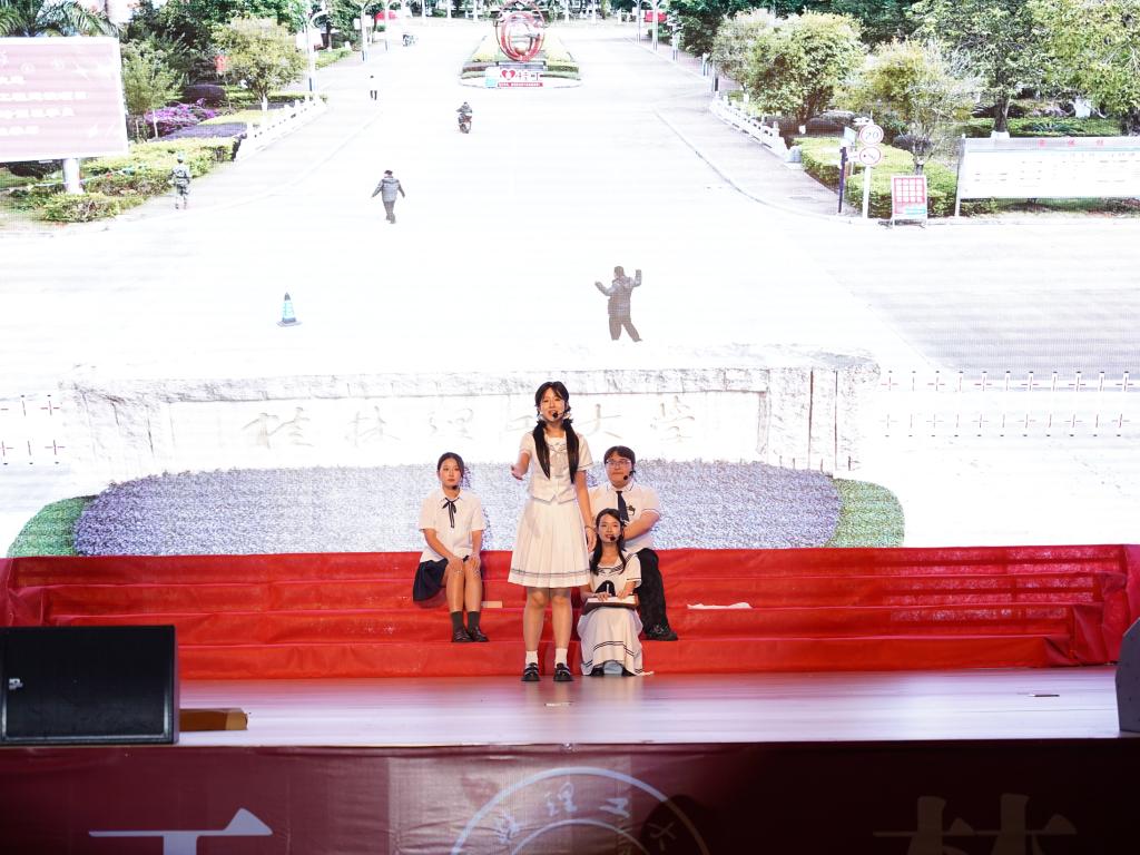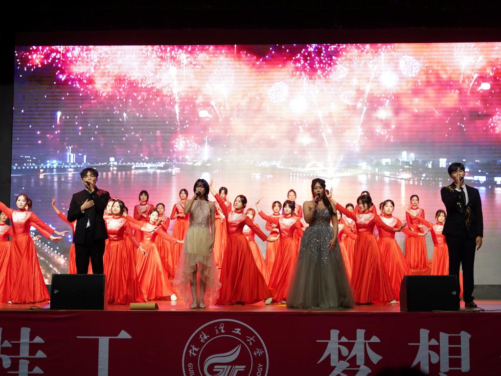 晚会以“回眸历史”与“青春砥砺”上下两篇为主线,通过舞蹈、朗诵、情景剧、音诗画、歌曲等多种艺术形式,生动展现了桂工学子传承红色基因、书写青春的使命担当。上篇以舞蹈《觉醒年代》开篇,演员们用铿锵有力的舞姿再现了近代民族觉醒的磅礴力量;情景朗诵《革命青年》和情景剧《为了新中国》深情讴歌了革命先辈的坚定信仰与牺牲精神;歌曲《天边》以悠扬旋律将观众带入对历史的深切追忆。下篇聚焦新时代青年的活力与担当,军体拳表演展现了桂工学子们的飒爽英姿;音诗画《对话1985》通过跨越时空的对话,彰显青年与历史的共鸣;街舞《One Day》则以动感节奏诠释了青春激情,将晚会气氛推向高潮。