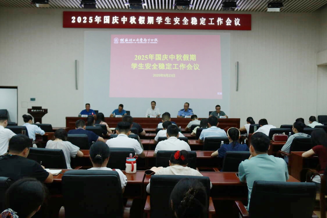 9月23日下午,南宁分校在空港校区图书馆报告厅召开2025年国庆中秋节假期学生安全稳定工作会议。南宁分校党委副书记唐承泽出席会议并讲话,扶绥县公安局驻校联络官黄志华警官受邀出席并讲话,学工部、保卫部、团委相关负责人,各学院副书记、团委书记及全体辅导员参加,会议由学工部负责人主持。